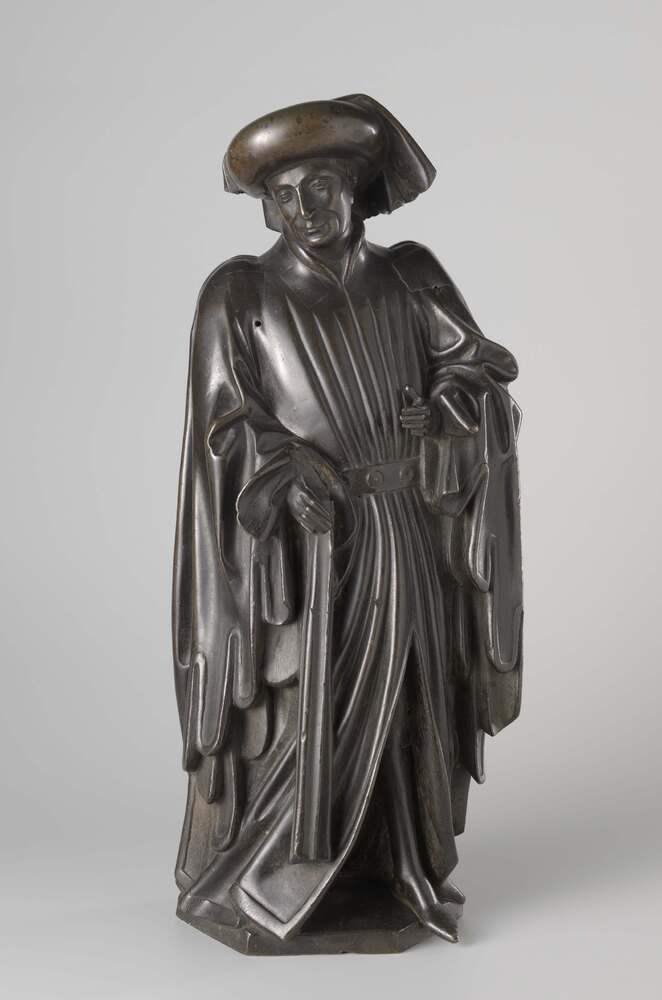 Een grafbeeldje uit een reeks van tien (oorspronkelijk 24), afkomstig van het praalgraf van Isabella van Bourbon (gestorven 1465), in 1476 opgericht in de Sint-Michaelsabdij te Antwerpen. Dergelijke graffiguren - in werkelijkheid verwanten van de overledene en rouwdragers of plorannen genoemd - maken deel uit van een middeleeuwse Zuidnederlandse traditie. De 'Amsterdamse' beeldjes zijn spiegelbeeldige kopieën van plorannen aan twee eerdere - eveneens 15de-eeuse en thans niet meer bestaande - graftombes te Brussel en Rijssel. Dit verklaart hun stilistisch wat vroeger te duiden uiterlijk. De onzekere identificatie der voorgestelden is mede het gevolg van het verloren gaan van de oorspronkelijke wapenschildjes en de vele plaatsverwisselingen die de beeldjes in de loop der tijd ondergingen. De tien plorannen moeten vóór 1678 van Isabella's tombe zijn verwijderd. Hoe ze in het bezit zijn gekomen van Jan de Vos is niet bekend. Zijn zoon Pieter de Vos, klerk ter secretarie in Amsterdam, zal de beeldjes van zijn vader hebben geërfd. In 1691 deed hij ze tegen een lijfrentee over aan het Amsterdamse stadsbestuur, dat in de veronderstelling verkeerde met figuren van Hollandse graven en gravinnen van doen te hebben.