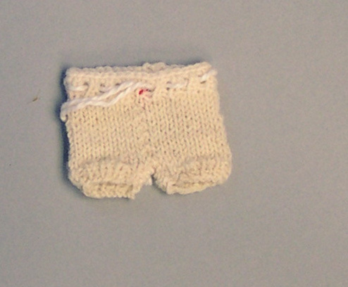 Korte broek, gebreid in tricotsteek van witte wol.- Trefwoorden