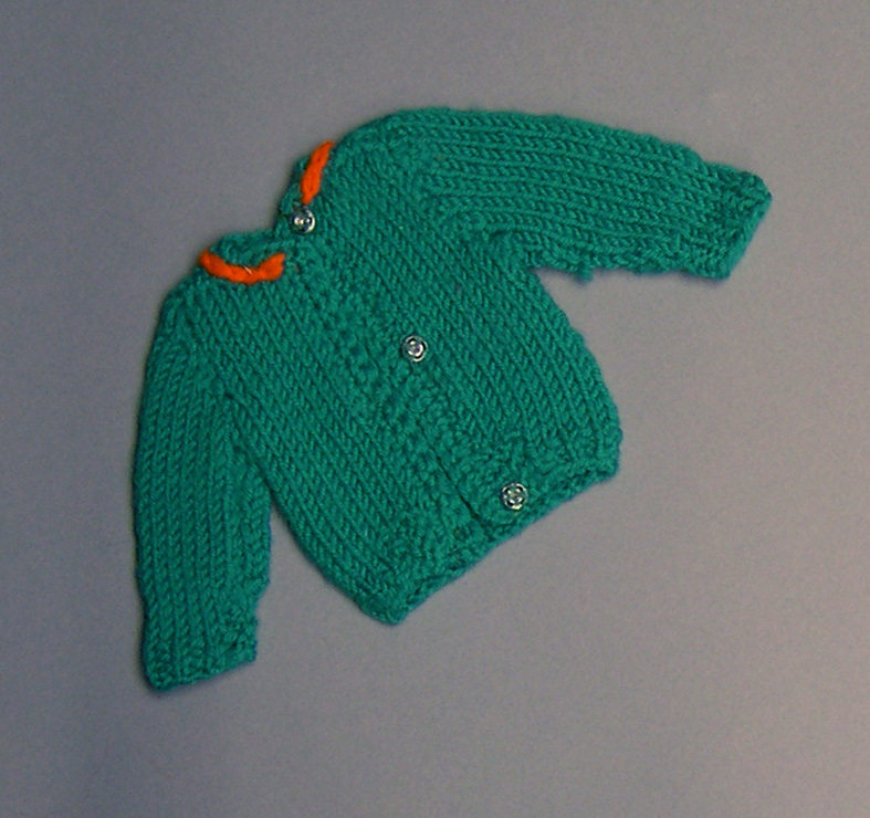 Vestje met lange mouwen en topje, gebreid van groene en oranje wol.- Trefwoorden