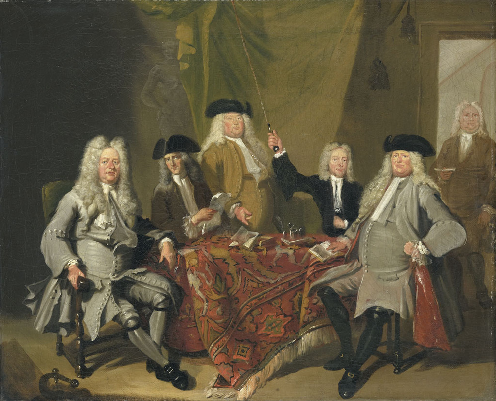 De inspecteurs van het Collegium Medicum te Amsterdam in 1724. Geportretteerd zijn van links naar rechts: Hendrik van Bronkhorst, Jeronimo de Bosch, Daniël van Buren, Martinus Haesbaert, Casparus Commelin en Joost ter Pelkwijk. Voorstudie voor grote schilderij met objectnr. SA 7411.
