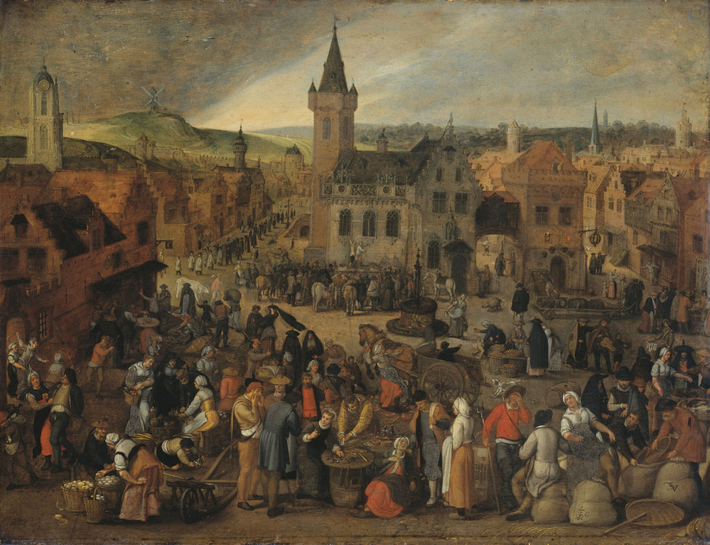 Marktdag in een Vlaamse stad. Gezicht op een plein in een stad. Op de voorgrond bieden marktlui hun waar te koop: eieren, groente, fruit, brillen en fluiten, vis en graan. Links wordt er voor een herberg gedanst. Op een schavot voor het stadhuis wordt een man gegeseld.