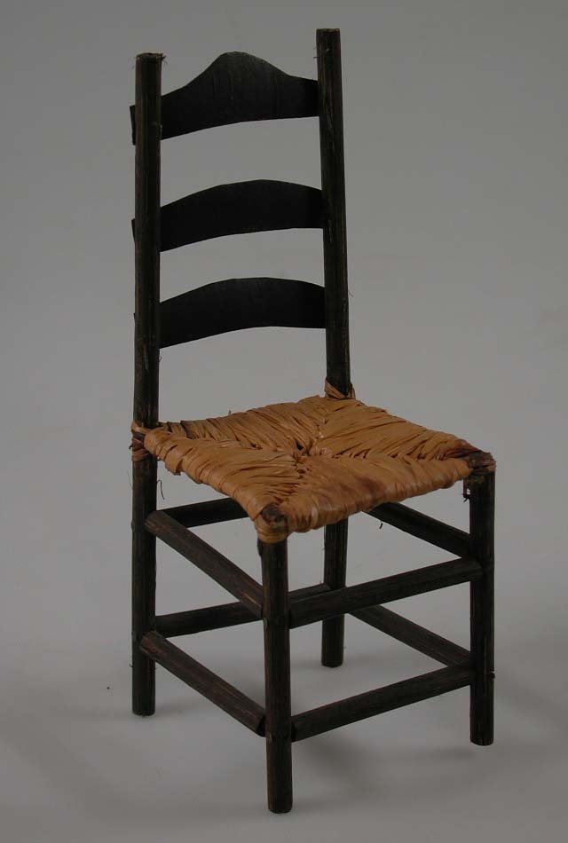 Houten stoeltje met rieten zitting en leren rugleuning.- Trefwoorden