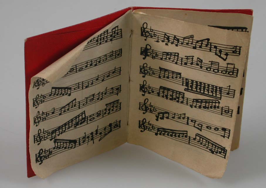 Miniatuurboekje van papier, met notenbalken.- Trefwoorden