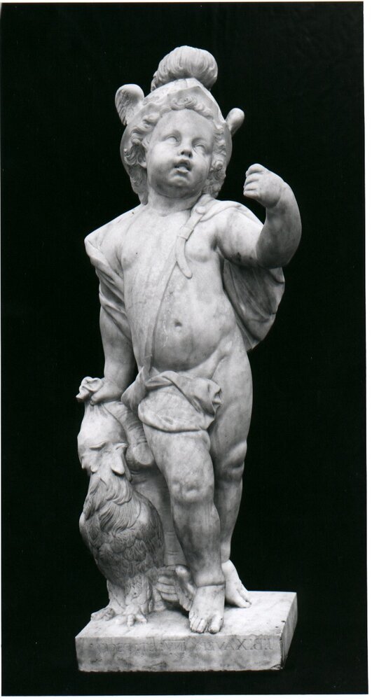 het kind met een hoorn waarin zich bloemen bevinden, is te karakteriseren als de verbeelding van de Overvloed; het gehelmde kind met in de linkerhand een geldzak en daaronder een haan, heeft in de rechterhand vermoedelijk een (nu verdwenen) staf gedragen: de attributen van Mercurius. ( Michiel Jonker)