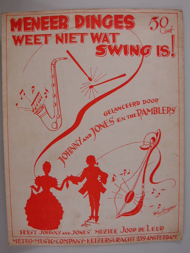 Deze bladmuziek hoort bij het razend populaire nummer 'Meneer Dinges weet niet wat Swing is' van Johnny and Jones. Johnny and Jones was een Amsterdams jazzduo, bestaande uit Nol (Arnold Siméon) van Wesel (1918-1945) en Max (Solomon Meyer) Kannewasser (1916-1945). Ze maakten humoristische parodieën, steevast in een Amerikaans accent uitgesproken. Hun grootste hit was ‘Mijnheer Dinges weet niet wat swing is’ uit 1938. Tijdens de Duitse bezetting mochten de joodse Nol en Max niet meer optreden. In 1943 werden ze samen met hun echtgenotes opgepakt en in kamp Westerbork tewerkgesteld. Ze zouden de oorlog niet overleven. ( Sarah Remmerts de Vries)
