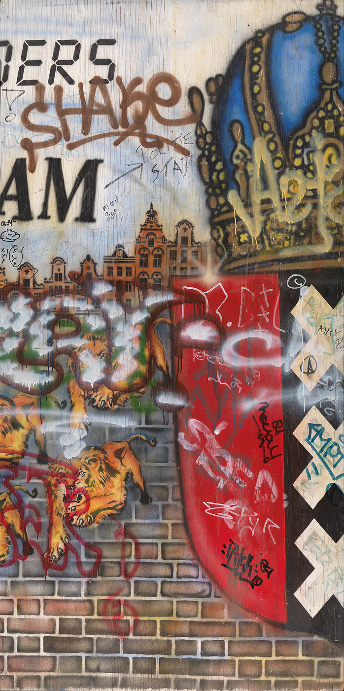 Van 1983 tot 1985 staat op het Waterlooplein een 60 meter lange schutting beschilderd door Hugo Kaagman. Daarachter ligt het bouwterrein waar het nieuwe gebouw van het stadhuis en de opera verrijst. Het is de tijd van het doemdenken, economische crisis, werkloosheid en de angst voor kernwapens. Dat verwerkt Kaagman in zijn beeldverhaal. In die jaren dat de schutting op het Waterlooplein staat voegen veel voorbijgangers er teksten en handtekeningen aan toe. ( Anneke van de Kieft)