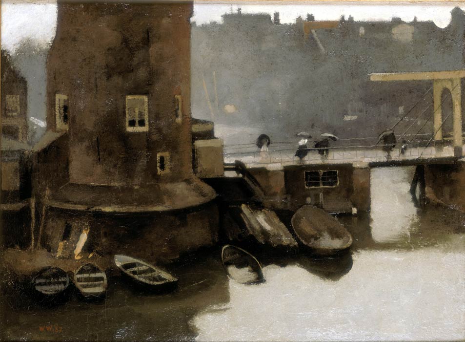 - TentoonstellingstekstVoordat Witsen in 1888 naar Londen vertrok, schilderde hij vanuit zijn atelier dit sfeervolle beeld van de Montelbaanstoren. De hier opvallend afgesneden toren zou nog veelvuldig in zijn werk terugkomen.