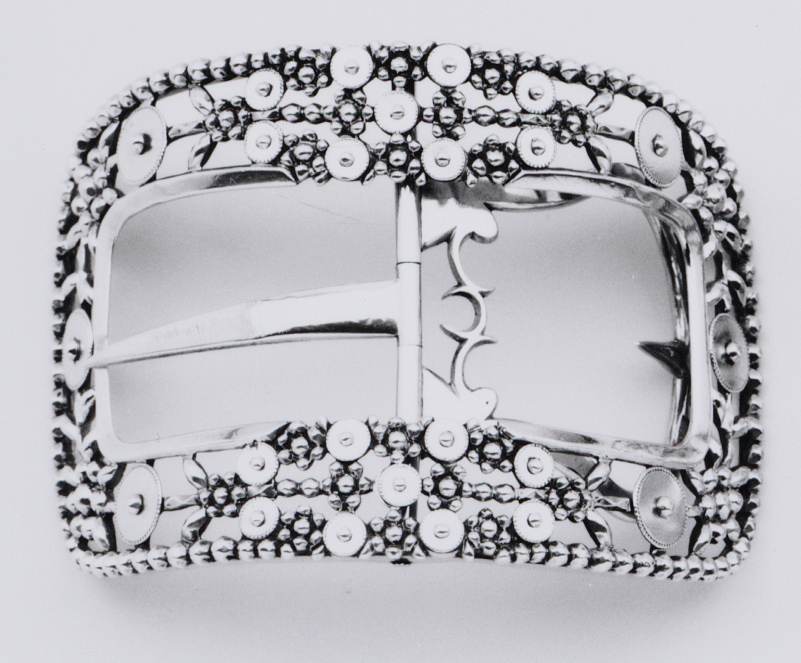Zilveren schoengespen behoorden omstreeks 1800 tot de modieuze kledingaccessoires, zowel in de stad als op het platteland. Deze exemplaren, bestemd voor herenschoenen, hebben mogelijk deel uitgemaakt van een streekdracht in West-Friesland. De gladde schijfjes in de rand, die enigszins aan stuivertjes doen denken, tonen verwantschap met die van een tasbeugel, in 1830 door Frans Ernst Held vervaardigd (cat.nr. KA 19278). Amsterdamse zilversmeden namen vanouds een groot deel van de productie van modeaccessoires voor de West-Friese markt voor hun rekening. Zie het commentaar bij cat.nr. KA 5507. ( Bert Vreeken)