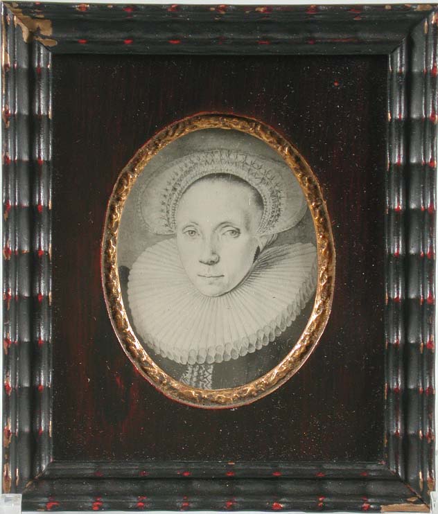 tekst achterzijde lijst: ALBUM BACKER no 18/BACKER GRIETIE/ Willem´s dr ex. LÖVEN LIJSBETH No 90/ x voor 1595 ROODHOORN/Cornelis Joris zn no 85: wit etiket met zwarte letters en een zwarte omlijning