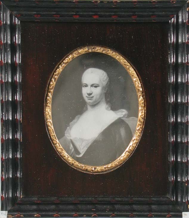 etiket achterzijde lijst: Backer Stichting/ Cornelia Maria Elias 1732-1769/ trouwt Jhr Henrick Backer./: wit, vierkant etiket met een dikke blauwe buitenrand en vier blauwe dunnere omlijningen met de tekst in het blauw geschreven.