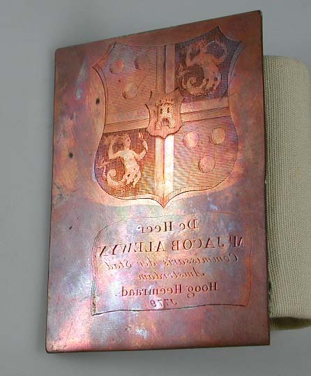 - Koperen plaat gegraveerd met wapen familie Alewijn en opschrift, in spiegelbeeld: De Heer/ Mr. JACOB ALEWIJN/ Commissaris der Stad/ Amsterdam/ Hoog Heemraad/ 1779, met papieren wikkel, 1779