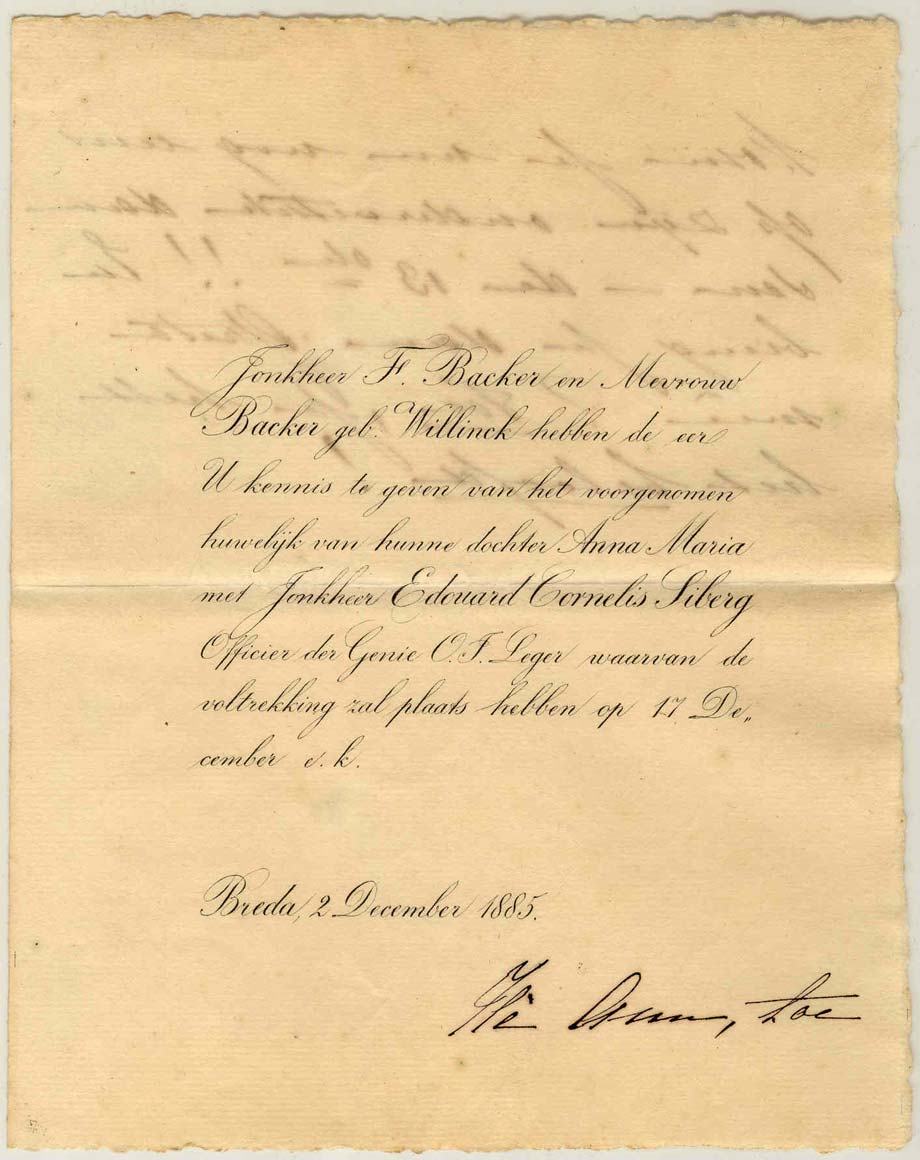 - Uitnodiging voor huwelijk van Anna Maria Backer en Jonkheer Eduard Cornelis Liberg, 1885 - 1886