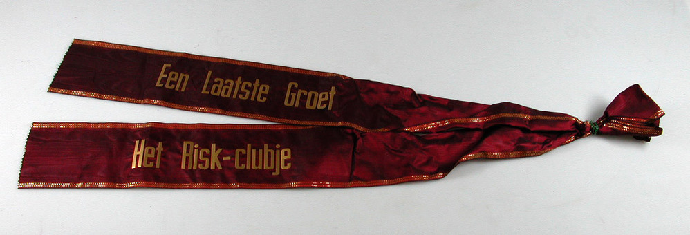Donkerrood lint met opdruk 'Een Laatste Groet/ Het Risk-clubje'.- Trefwoorden
