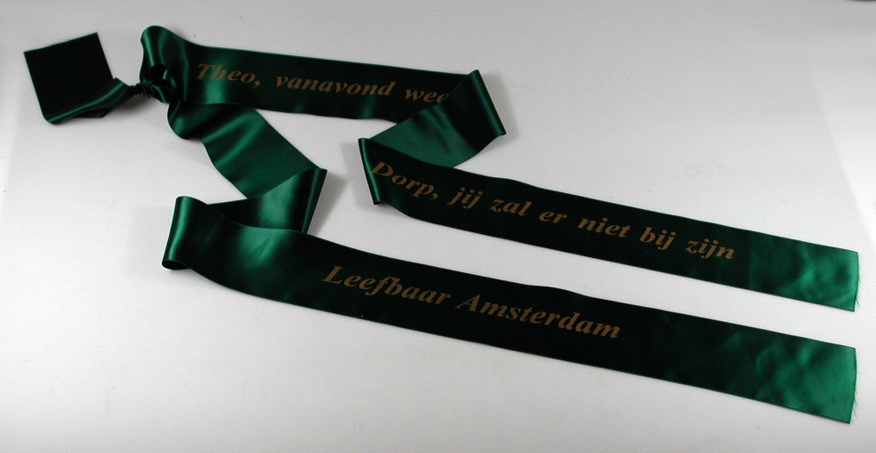 Twee donkergroene linten met opdruk 'Theo, vanavond weer Barend en van Dorp, jij zal er niet bij zijn, Leefbaar Amsterdam'- Trefwoorden