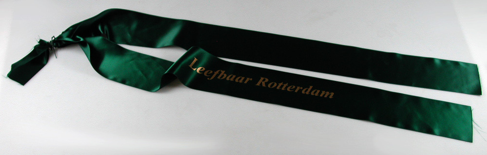 Twee donkergroene linten met opdruk 'Eeuwig zonde/Leefbaar Rotterdam'- Trefwoorden