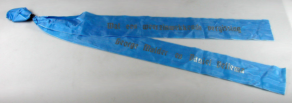 Twee lichtblauwe linten met opdruk 'Wat een weerzinwekkende vergissing/George Mulder en Daniel Vellema'- Trefwoorden