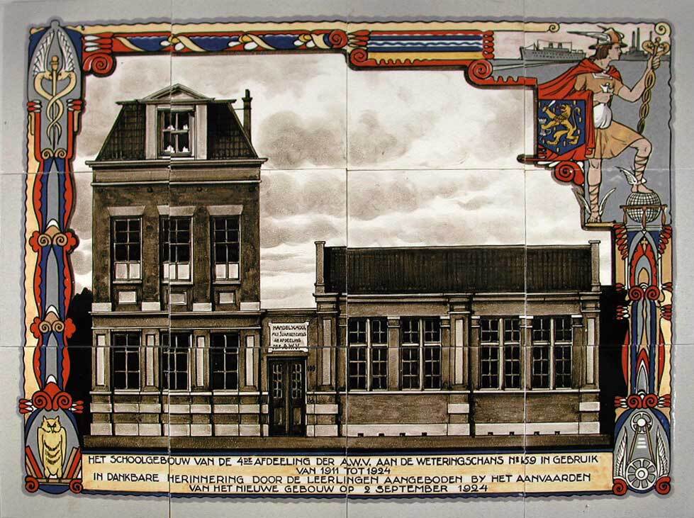 Een tegeltableau is een vlak, bestaande uit meerdere aardewerken tegels, die door een schildering één voorstelling vormen. Tegeltableaus werden vanaf de zeventiende eeuw populair, omdat ze zowel decoratief als functioneel waren. Ze boden uitkomst tegen vocht, waar huisjes langs grachten en kanalen nogal eens last van hadden, en waren gemakkelijk schoon te houden. Daarnaast zorgden de uit Italië afkomstige vormen, kleuren en motieven voor een vrolijke aanblik rond de haard of in de gang. In de periode van de Jugendstil (ca. 1900) leefde de aandacht voor tegeltableaus opnieuw op. Families en bedrijven die het zich konden veroorloven, lieten wanden, gevels en portieken versieren met tegeltableaus in Art Nouveau stijl. Ook voor jubilea en andere feestelijke gelegenheden werden soms tegeltableaus vervaardigd. Dit tegeltableau is door Plateelbakkerij Delft N.V. vervaardigd voor de 4e afd. van de A.W.V., ter gelegenheid van het aanvaarden van een nieuw schoolgebouw in 1924. ( Sarah Remmerts de Vries)