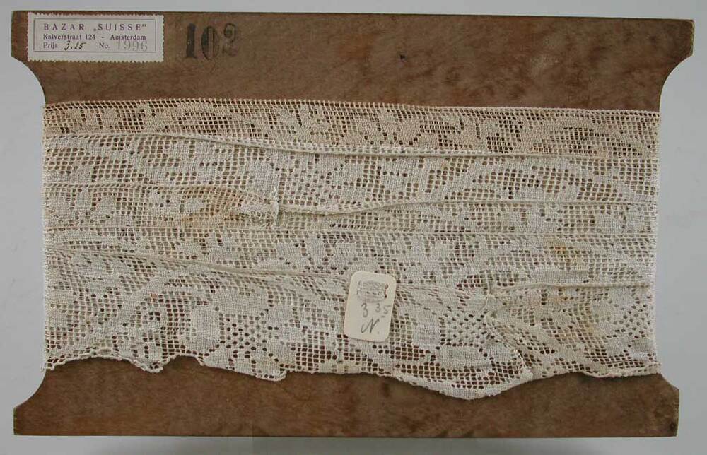 Strook katoenen kant, geschulpt aan onderzijde. Strook is om plaat triplex gewikkeld.