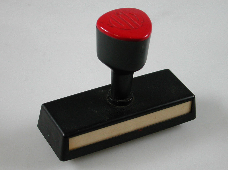 Zwarte plastic stempel met rode knop, met handtekening van H. Bunjes in spiegelbeeld. Aan voorzijde venster met daarachter wit papier.- Trefwoorden