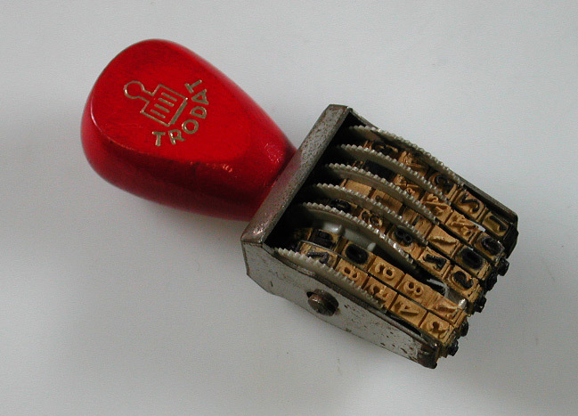 Plastic stempel met rode knop, met zes verdraaibare ringen met getalreeksen in spiegelbeeld.- Trefwoorden