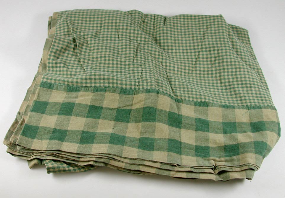Katoenen kleed, klein groen/geel ruitje, afgezet met een brede strook van een grotere ruit in dezelfde kleurstelling.- Trefwoorden