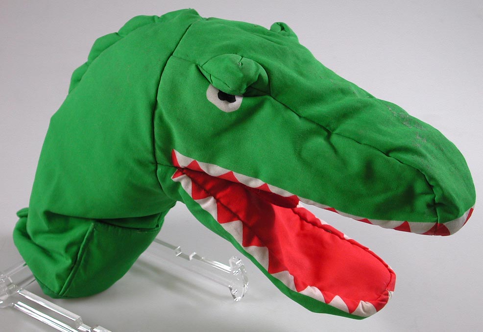Stoffen hardgroene handpop voorstellende krokodil, met vuurrode bek.- Trefwoorden