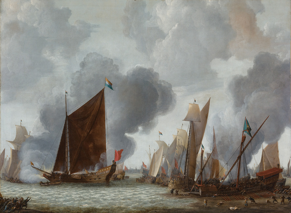 Dit schoorsteenstuk werd bij de bouw van de regentenkamer geschilderd. Het verbeeldt een oorlogshandeling uit de Tachtigjarige Oorlog. Op 12 september 1631 versloegen de Zeeuwen een Spaanse vloot in het Slaak, tegenwoordig het Grevelingenmeer. ( Norbert Middelkoop)