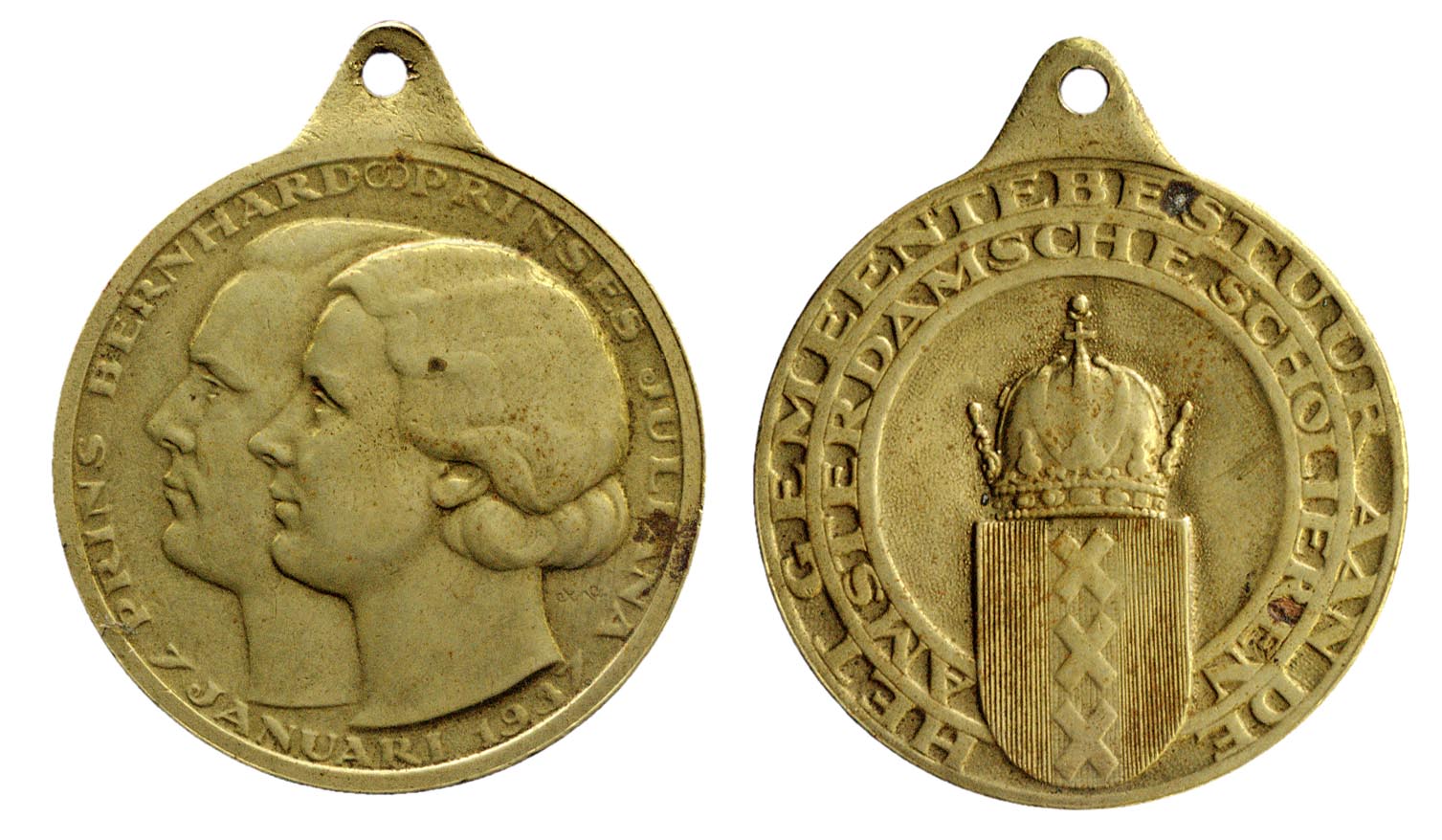 Draagpenning, aan de Amsterdamse scholieren uitgereikt ter gelegenheid van het huwelijk van Prinses Juliana met Prins Bernhard van Lippe Biesterfeld op 7 januari 1937. Op de voorzijde de portretten en profil van het bruidspaar. Op de keerzijde het stadswapen. ( Judith van Gent)