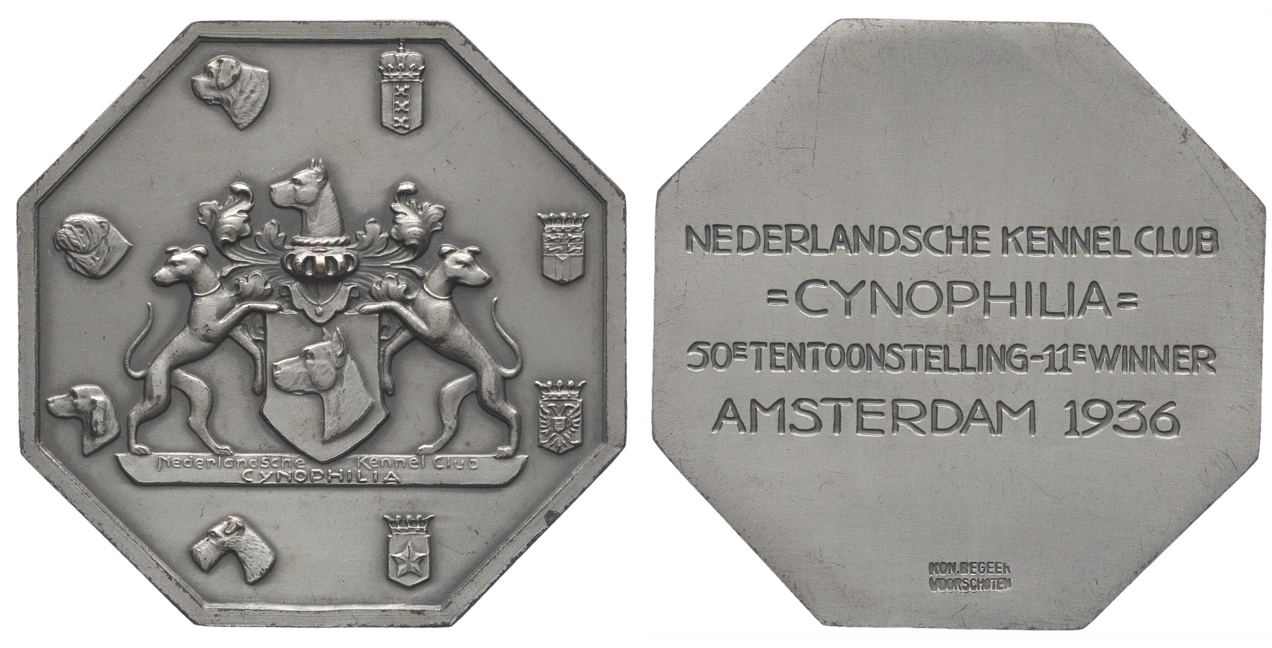 opschrift keerzijde: NEDERLANDSCHE KENNEL CLUB / =CYNOPHILIA= / 50E TENTOONSTELLING-11E WINNER / AMSTERDAM 1936