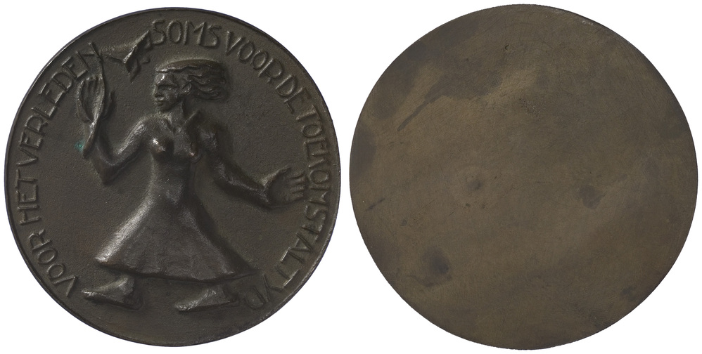 voorzijde: een lopende vrouw naar links met lelie en naar achter wapperende haren in een omschrift. keerzijde: onbewerkt.- Trefwoorden
