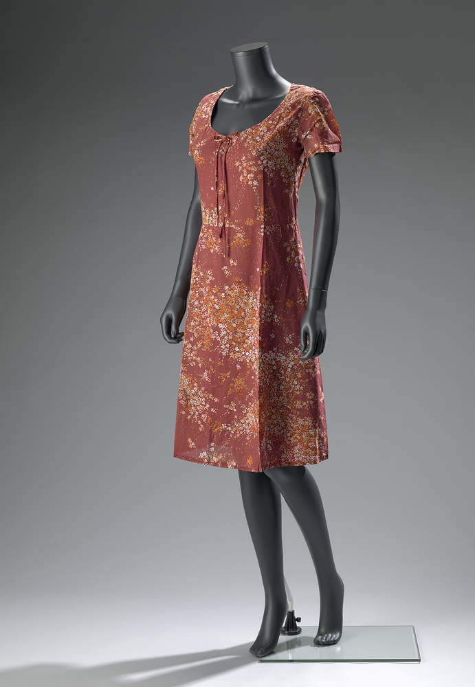 Zomerjurk van gebloemde katoen, met lage ronde hals, taillenaad, gerende rok en korte mouwen. Gevoerd met paarse voeringzijde. Sluiting middenachter door middel van ritssluiting.