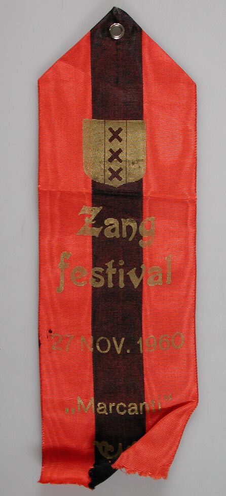 Rood ripslint met een zwarte baan in het midden. De bovenkant is in een punt gevouwen en voorzien van een ingeponst metalen oogje. Bedrukt: het wapen van Amsterdam, met daaronder 'Zang festival, 27 NOV. 1960, "Marcanti".- Trefwoorden