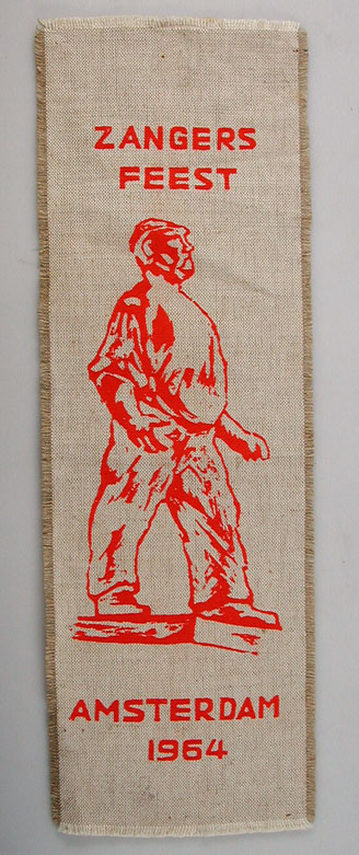 Vaantje in rood bedrukt 'Zangersfeest, Amsterdam 1964' met een afbeelding van de dokwerker.- Trefwoorden