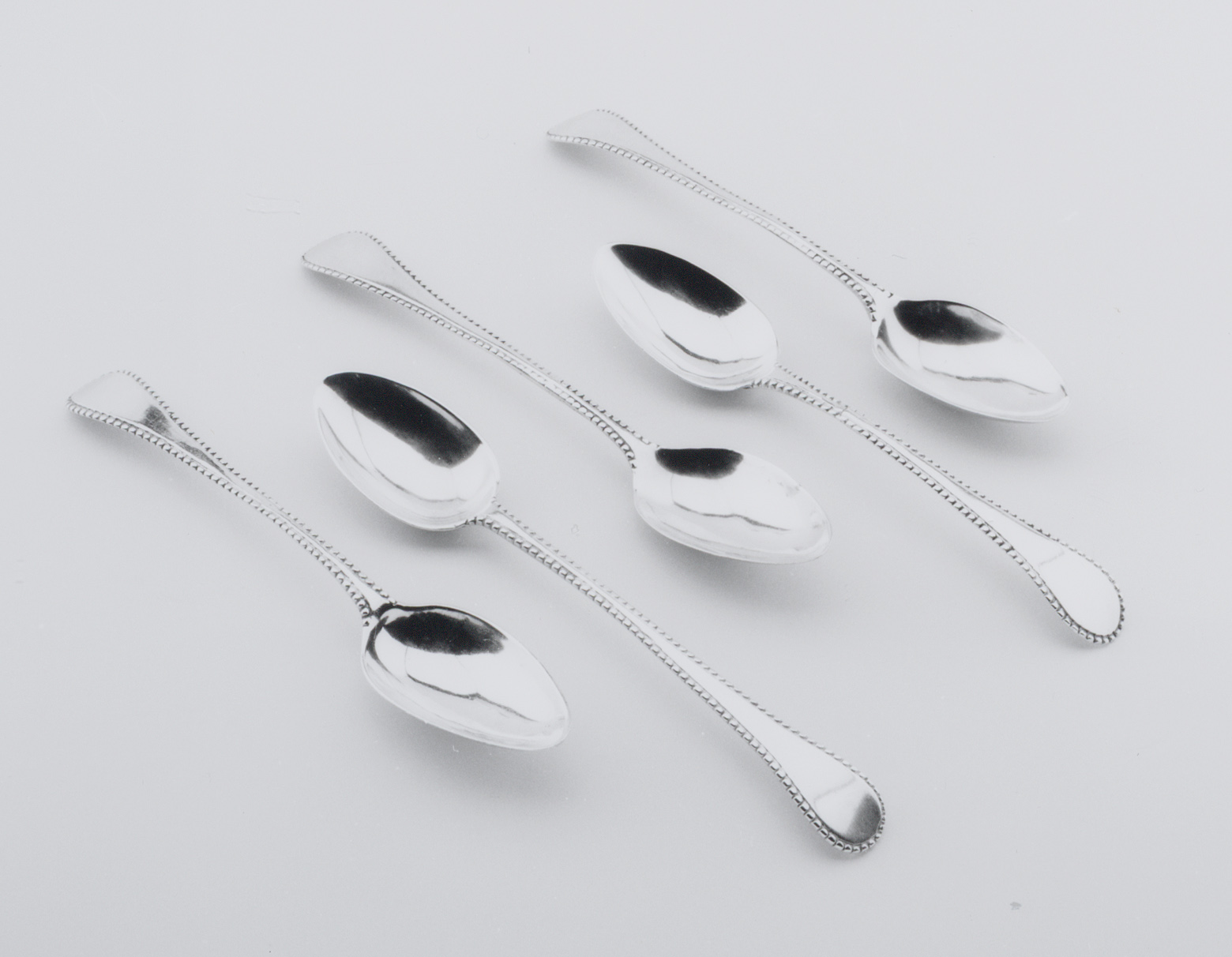 De lepeltjes kunnen zowel voor koffie als thee zijn gebruikt, een onderscheid is niet goed te maken. Uit de administratie van As. Bonebakker & Zoon blijkt dat theelepels de ene keer zwaarder en de andere keer lichter zijn dan koffielepels. Lepels als deze zullen oorspronkelijk geborgen zijn geweest in een lepeldoos (cat.nr. KA 18813) of aan de rand van een suikervaas hebben gehangen (Nederlandse 1975, afb.1). Mevrouw S.A. Lopez Suasso-de Bruijn bezat omstreeks 1885 onder meer 'negen lepeltjes met parelrandjes Amsterdamsche Keur' (*Lopez Suasso-de Bruijn [ca. 1885], [p. 66] nr. 20) en het echtpaar Willet-Holthuysen een 'Suite de six cuillers à thé [...]' van verguld zilver (Frederik Muller 1895, p. 18 nr. 121; Vreeken 1999, p. 17). Zie over thee- en koffielepels: Wttewaall 1994~2, p. 152-156. ( Bert Vreeken)