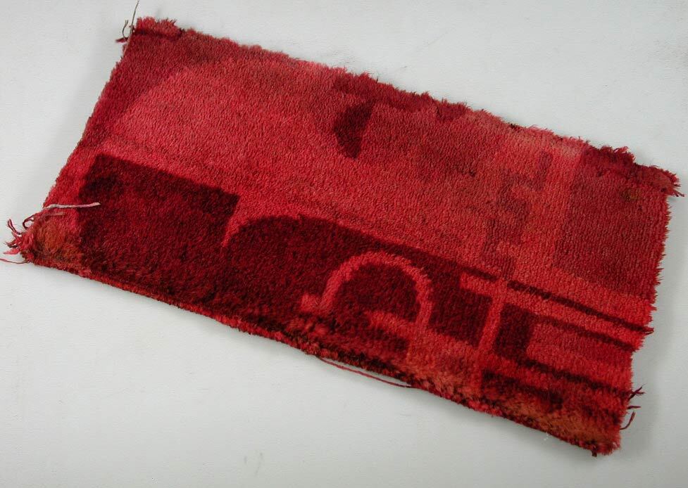 Vloerbedekkingsfragment uit Tuschinski. Poolweefsel uit de jaren 30, van wol in verschillende kleuren rood. Geometrisch motief. Waarschijnlijk afkomstig uit de grote zaal of de wandelgang.- Trefwoorden