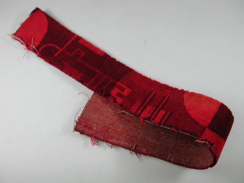 Vloerbedekkingsfragment uit Tuschinski. Poolweefsel uit de jaren 30, van wol in verschillende kleuren rood. Geometrisch motief. Waarschijnlijk afkomstig uit de grote zaal of de wandelgang.- Trefwoorden