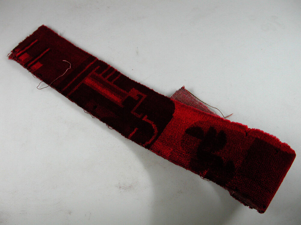 Vloerbedekkingsfragment uit Tuschinski. Poolweefsel uit de jaren 30, van wol in verschillende kleuren rood. Geometrisch motief. Waarschijnlijk afkomstig uit de grote zaal of de wandelgang.- Trefwoorden