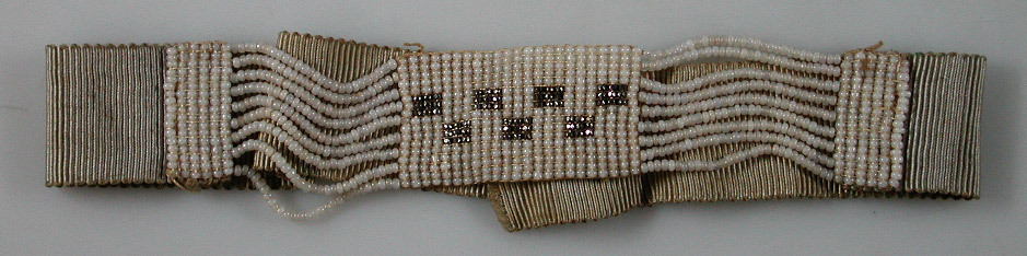 Halsband van zwarte ripszijde met middenvoor kralenwerk van kleine witte kraaltjes, op het middengedeeltje versierd met blokjes van zilverkleurige kraaltjes.Sluiting met een drukknoopje middenachter.