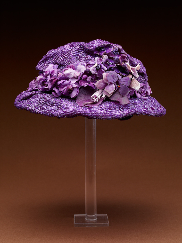 Hoedje in vorm van geplooide bol en smalle rand, van donkerpaars cellophane-weefsel. Bol is versierd met kunstbloemen van verschillende tinten paars en een paars fluwelen lint. Voering van naturelkleurige voeringzijde.