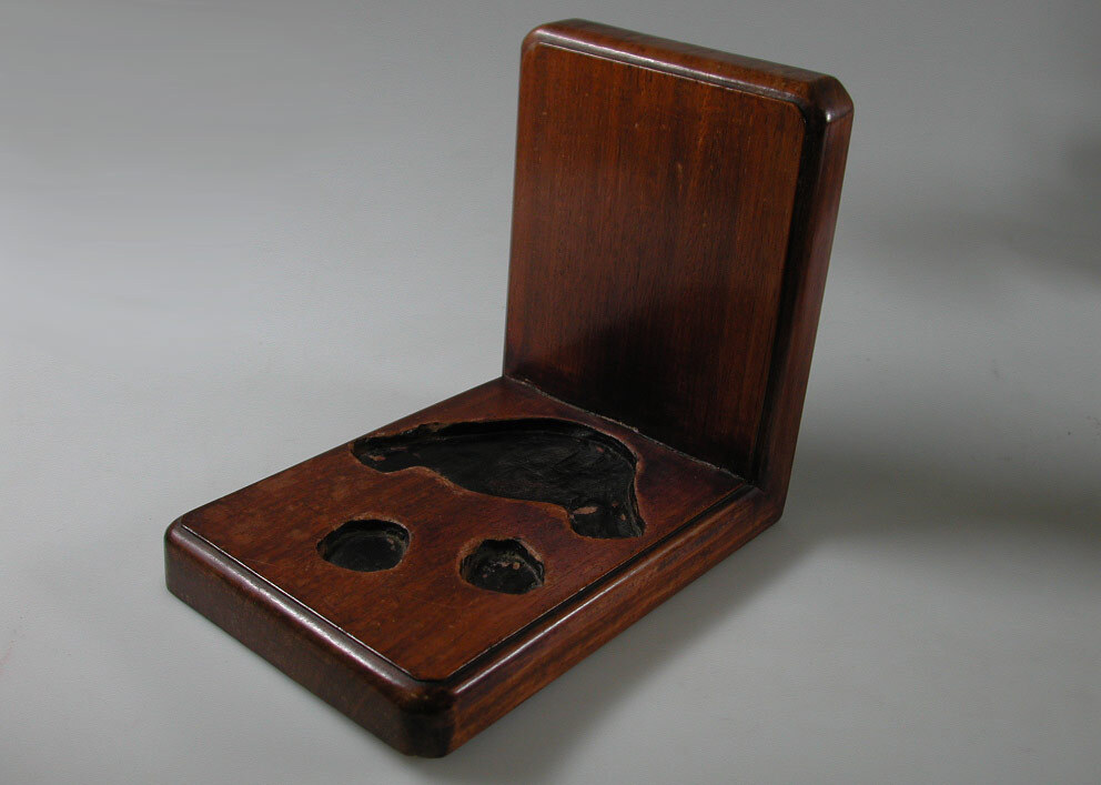 Houten standaard waarin uitsparingen voor porseleinen hondje KA 22049.3- HerkomstBruikleen Gally Wu, 1999; in 2005 door de erven van Wu aan het museum geschonken.