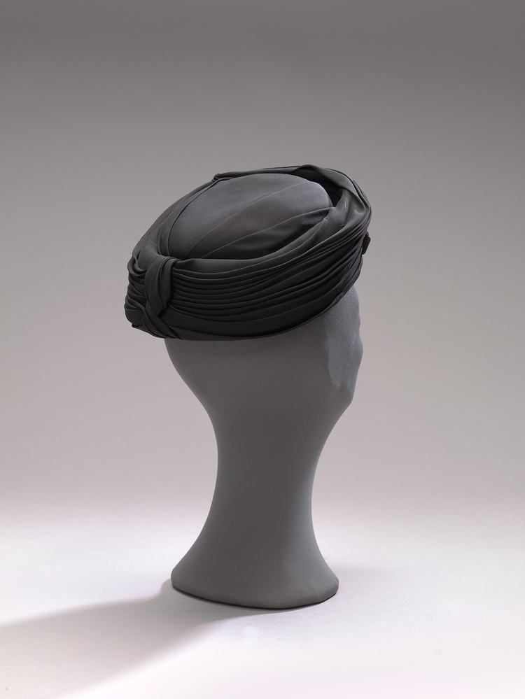Gedrapeerde hoed, tulbandmodel, van in vorm geplooide zwarte gazen stof, gezet op een ondergrond van sparterie. Voeringkapje van zwarte voeringzijde.