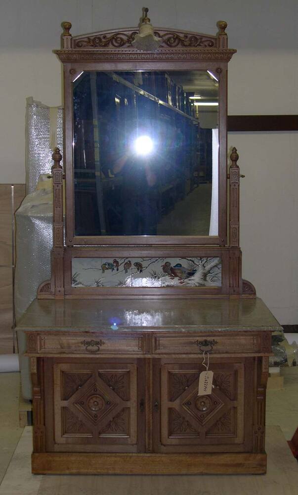 Massief notenhouten kast. Onderkast is uitgevoerd met twee deurtjes en afgedekt met wasdoek. Daarop rust ladeblok, ondersteund door kwart cirkelvormige consolestukken. Ladeblok wordt afgedekt door marmeren blad. Op geheel is spiegelhouder gemonteerd; twee stijlen die bijeen gehouden worden door een plint met beschilderde tegels (vogels in winterlandschap). Tussen stijlen is spiegel gemonteerd met in kapregel kelkvormig electrisch lampje. Meubel is uitgevoerd met geprofileerde stijlen, waartussen kraalschroten (zijden), ruitvormige paneelvullingen (deurtjes) en enige gestileerd snijwerk van florale motieven. Transparante vernisafwerking.