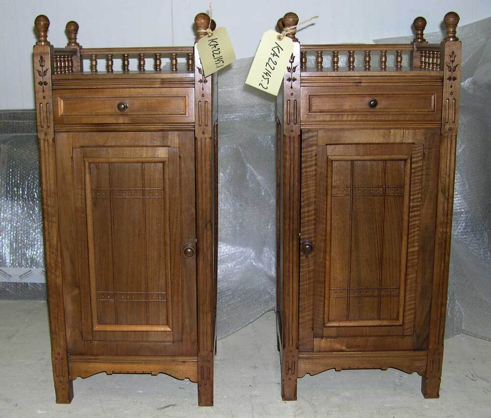 Twee nachtkastjes in massief noten, voorzien van lade bovenin en deurtje eronder met daarachter twee legplanken. (Afhankelijk van positie naast bed rechts – KA 22145.2, of linksdraaiend - 22145.1). Meubeltjes rusten op geprofileerde stijlen bekroond met bolvormen, onderling verbonden door regels en rond bovenblad aan drie zijden een lage balustrade. Zijwanden en deurpaneel gevuld met kraalschroten. Dunne glansvernis of wasafwerking.