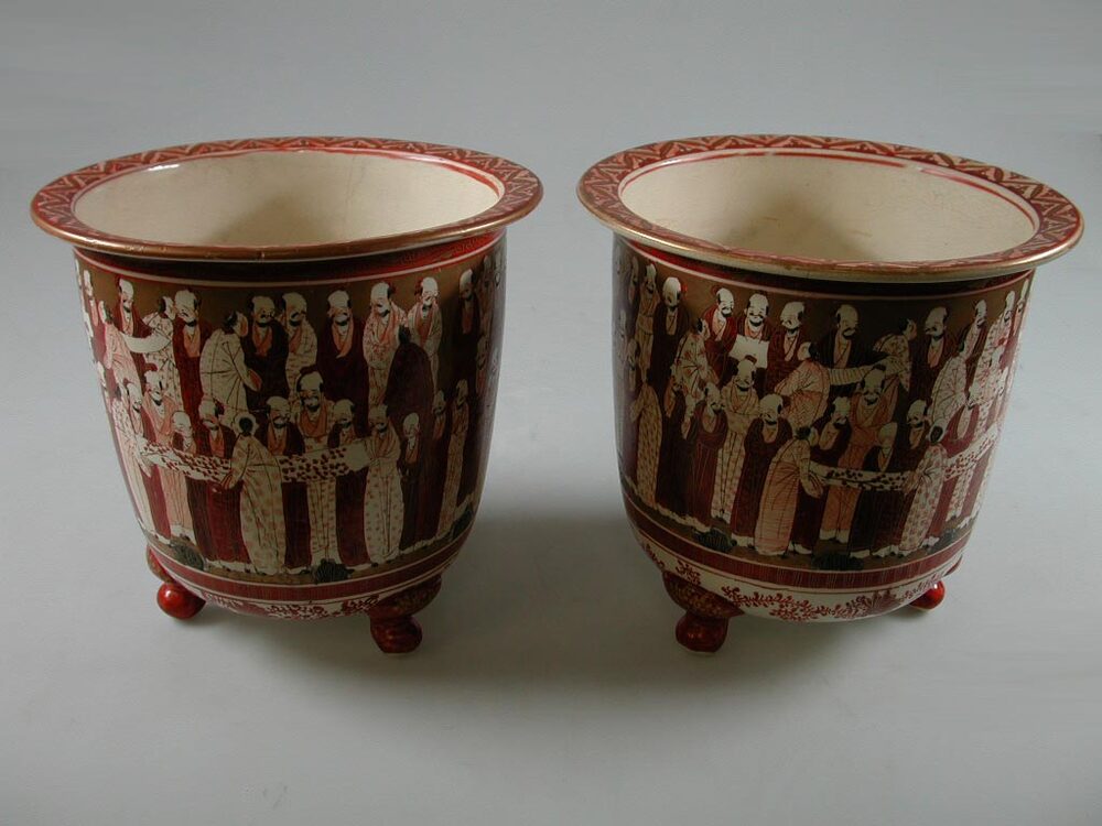 Deze twee Chinese bloempotten komen uit het bezit van de Amsterdamse architect Abraham Salm (1857-1915). Samen met zijn vader Gerlof Bartholomeus Salm (1831-1897) heeft Abraham een grote bijdrage geleverd aan de stedenbouwkundige veranderingen in Amsterdam in de tweede helft van de negentiende eeuw. Waar G.B. Salms naam onlosmakelijk verbonden is met de bouw van Artis in de Plantage, staat zoon Abraham vooral bekend om zijn herenhuizen, stadsvilla’s, (sigaren)fabrieken en paardentramremises, aanvankelijk in classicistische, later in meer historiserende eclectische stijl. Daarnaast ontwierp hij ook interieuronderdelen. Deze bloempotten zijn afkomstig uit het door A. Salm ontworpen huis aan de Weesperzijde 26, waar hij zelf woonde en werkte. ( Sarah Remmerts de Vries)