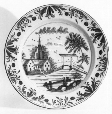 rand: bladmotief; midden: landschap met kerk en ophaalbrug- Trefwoorden