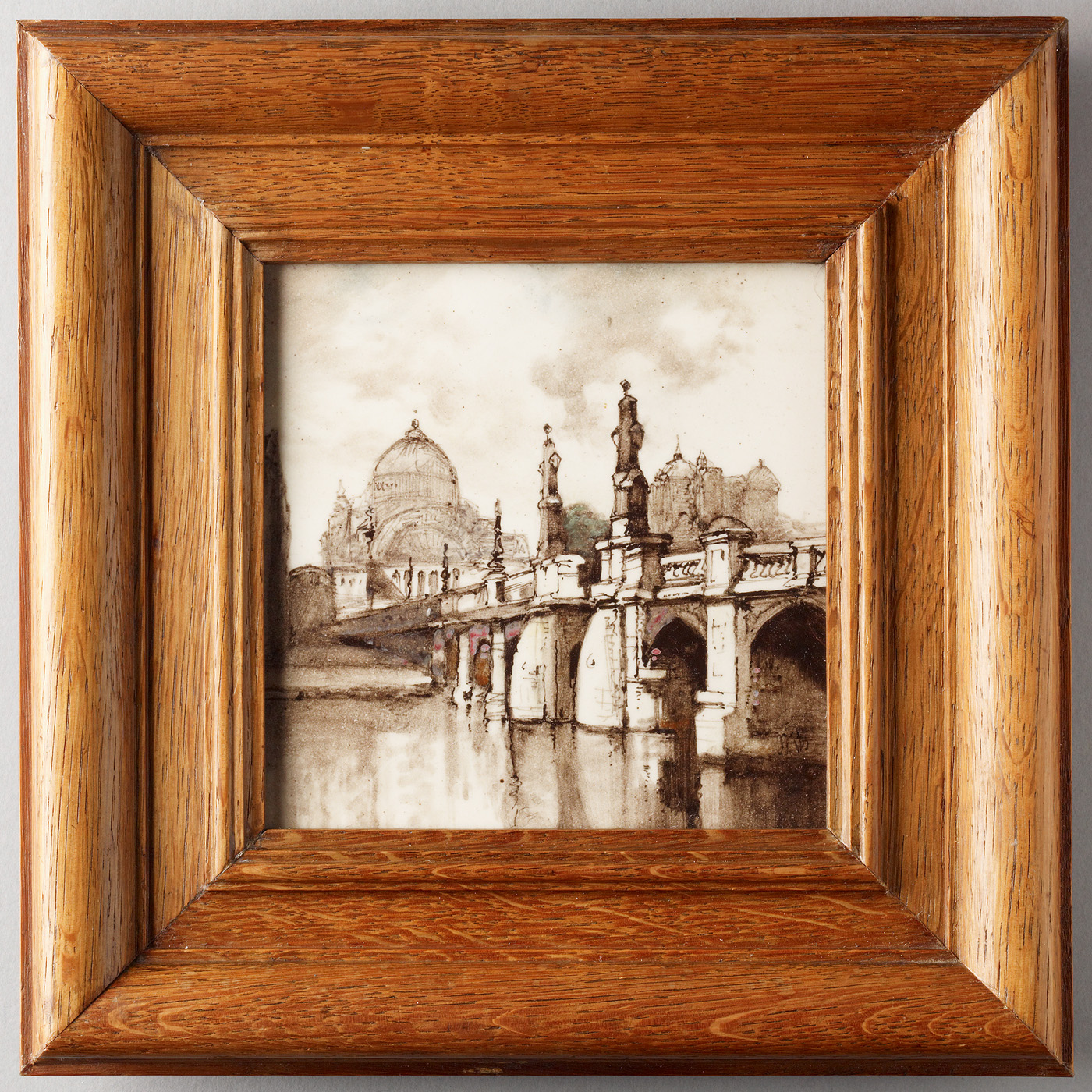 - Een tegel van beschilderd aardewerk uit omstreeks 1907. We kijken vanaf de kade van het Amstelhotel uit op Hogesluis en Amstel, waarachter het Paleis opdoemt. ( Frans Oehlen)