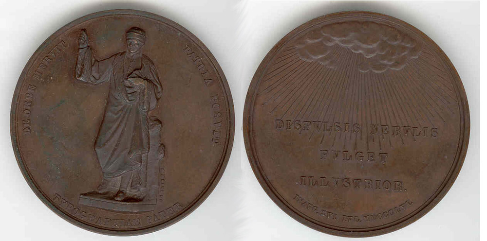 omschrift voorzijde: DE ORBE MERVIT PATRIA POSVIT TYPOGRAPHIAE PATE