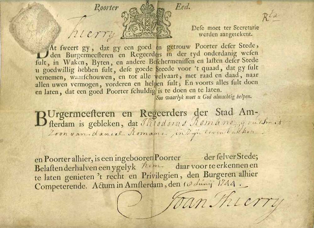 - Poortereed van Theodorus Romane, goudsmid, d.d. 18 juni 1744, 1744