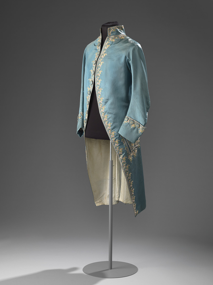 Achttiende-eeuwse mannenkleding van de elite is net zo luxueus en aan mode onderhevig als de dameskleding en bestaat gedurende deze hele periode uit een knielange jas, een vest en een nauwe kniebroek. Het driedelig pak is voor het eerst gedragen door de engelse koning Charles II in 1666 en vervangt de wambuis. Pas in de achttiende eeuw dringt deze mode via Frankrijk door op het Europese vasteland. Het is de voorloper van het ons nu nog bekende mannenpak. Mannen zijn gekleed in dezelfde luxe stoffen, levendige kleuren en uitbundige decoratie als vrouwen. In de hals wordt een kanten jabot gedragen, uit de mouwen steken kanten stroken en aan de benen worden kostbare zijden kousen gedragen met lage puntige schoenen met gespen. ( Annemarie den Dekker)
