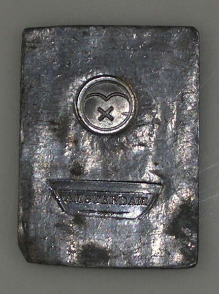 éénzijdig rechthoekig loodje met een merkteken in de vorm van een kruisje in een cirkel en daar onder het opschrift AMSTERDAM op een schaal.- Trefwoorden